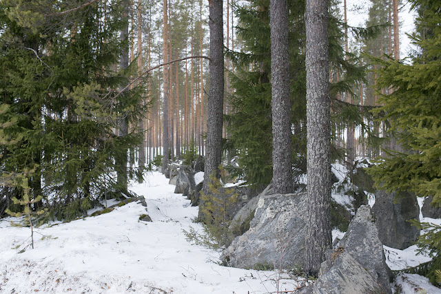 Kävimme tutustumassa Rukajärventien maastoihin vuoden viimeisillä talvikeleillä. Viikko ennen pääsiäistä oli varmasti viimeinen hetki ennen kelirikkoa Pohjois-Karjalan metsäautoteillä, ja hankikin kantoi suksea hyvin aamupäivästä. Alunperin oli tarkoitus tehdä pitempi retki Cajanderin aarniometsä alueella, mutta oma sairastuminen paria päivää ennen lähtöä muutti suunnitelmat kevyemmäksi kulttuuri- ja sotahistorialliseksi tutkimusmatkaksi alueelle.